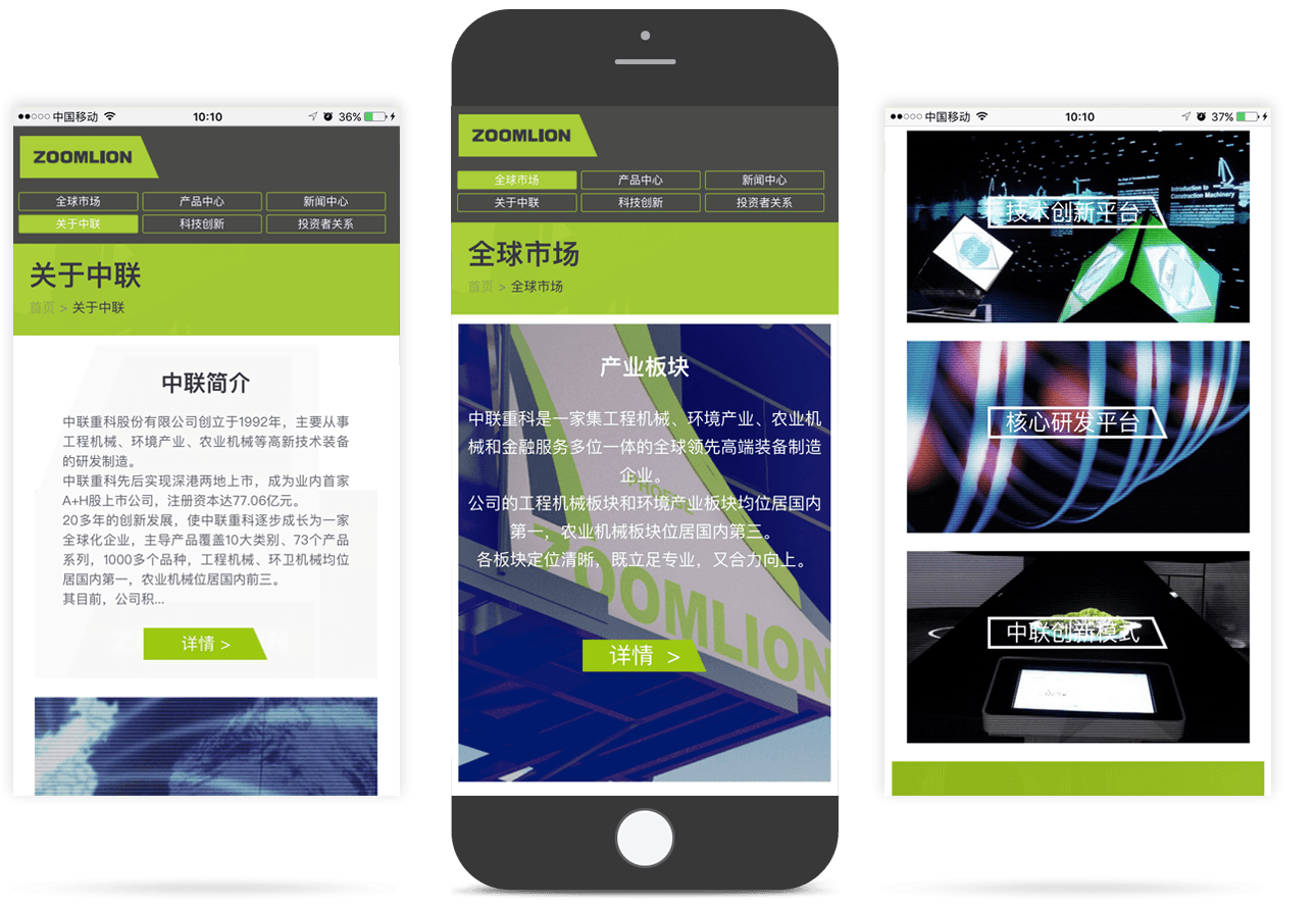 網(wǎng)站針對(duì)【關(guān)于中聯(lián)】頻道采用圖片、文字、視頻等多種元素結(jié)合的表現(xiàn)方式,塑造更加立體、多元、多維度的企業(yè)形象。視頻的創(chuàng)新應(yīng)用結(jié)合視覺(jué)、聽覺(jué)等多重感官, 豐富用戶的瀏覽體驗(yàn)。