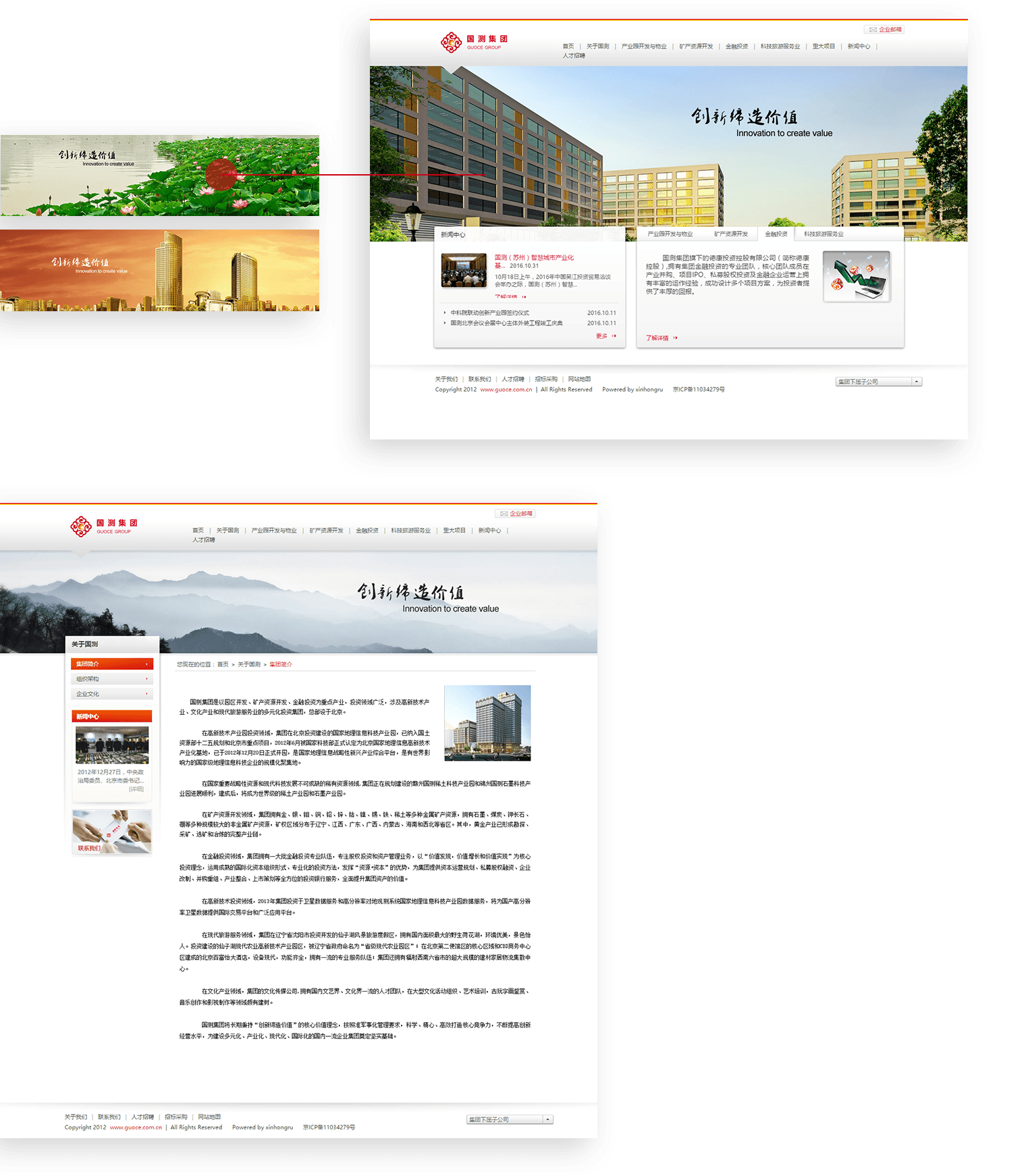 Banner視覺區(qū)通過集團形象、荷花、業(yè)務(wù)等不同角度進行表達,虛實結(jié)合、業(yè)務(wù)與文化相結(jié)合,塑造