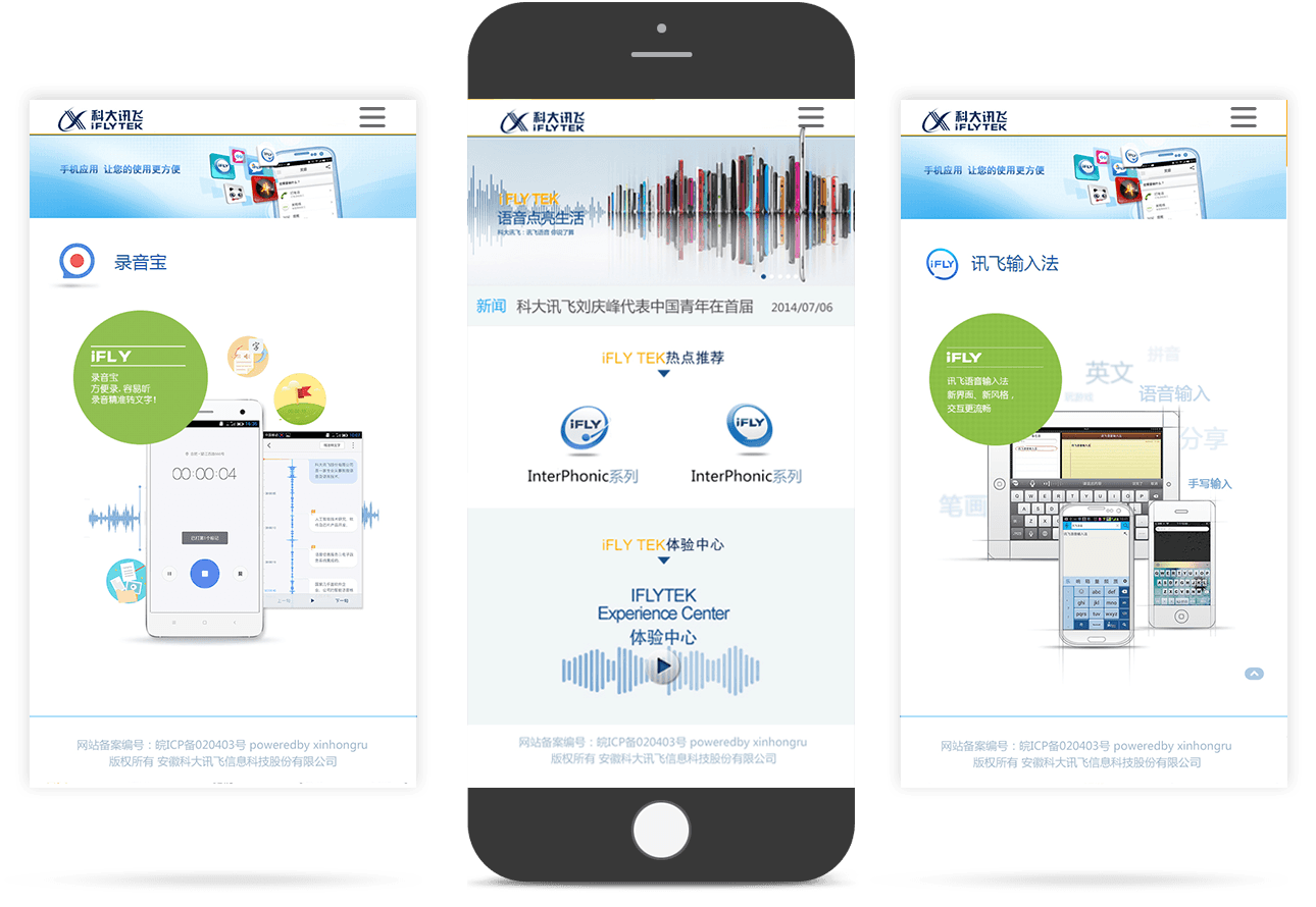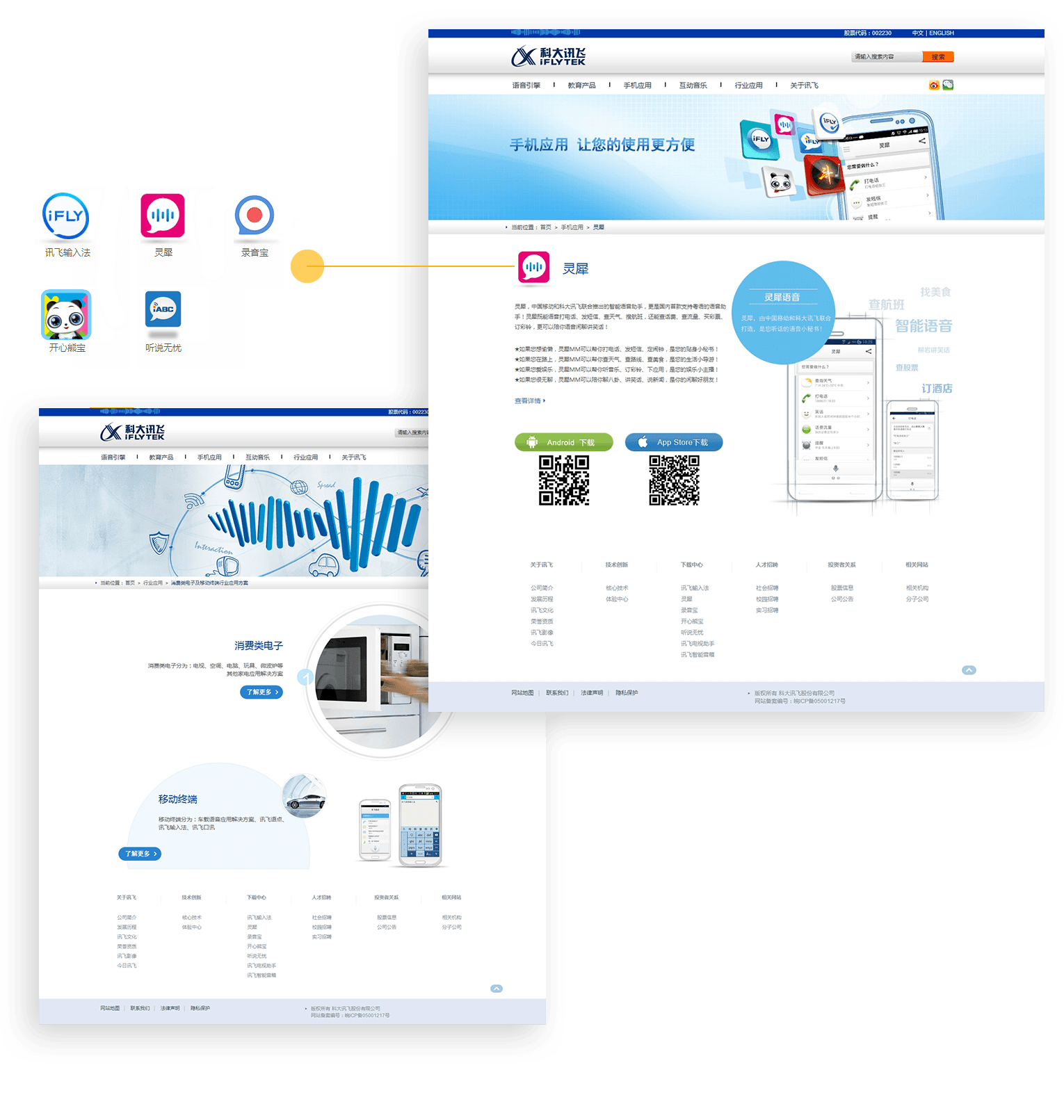 網(wǎng)站以藍(lán)色為主要色調(diào),以“語(yǔ)音引擎-教育產(chǎn)品-手機(jī)應(yīng)用-互動(dòng)音樂(lè)-行業(yè)應(yīng)用-關(guān)于訊飛”為主要欄目導(dǎo)航,
