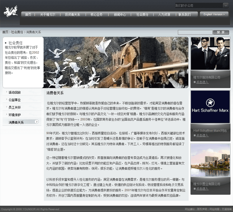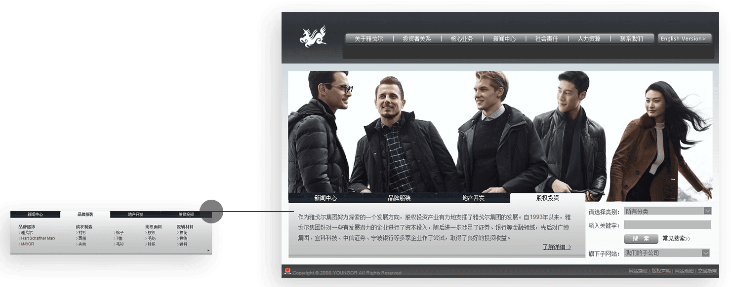 新鴻儒結(jié)合雅戈爾集團的整體視覺規(guī)范,為雅戈爾建設(shè)了集團官網(wǎng)及系列旗下品牌網(wǎng)站。不僅在設(shè)計上體現(xiàn)雅戈爾品牌