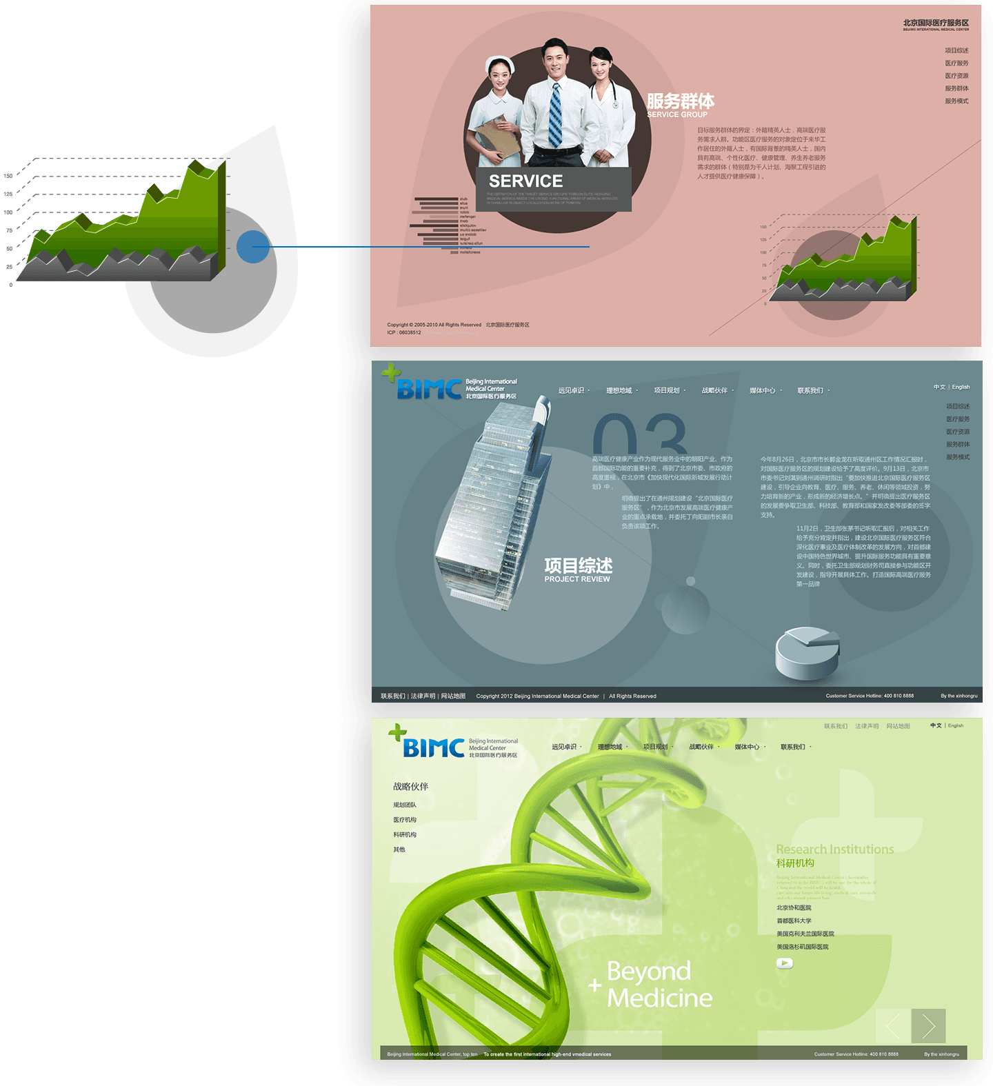 網(wǎng)站利用視頻元素和FLASH技術,實現(xiàn)三維立體的動畫表現(xiàn),展示北京國際醫(yī)療服務區(qū)全貌,形成強烈的視覺感受,塑造北京國際醫(yī)療服務區(qū)的品牌形象。同時,網(wǎng)站中大量鼠標交互效果,充分調動訪問者的興趣,提升用戶的瀏覽體驗。