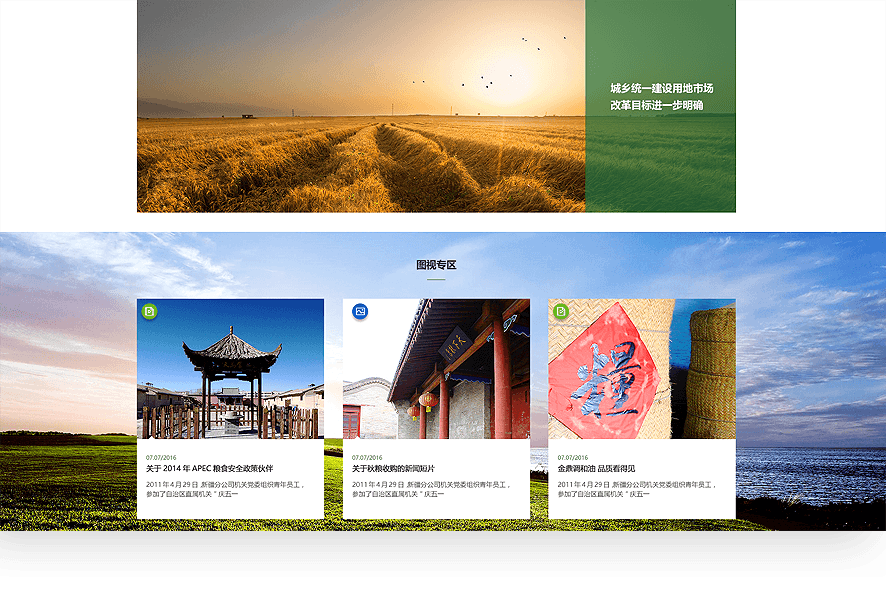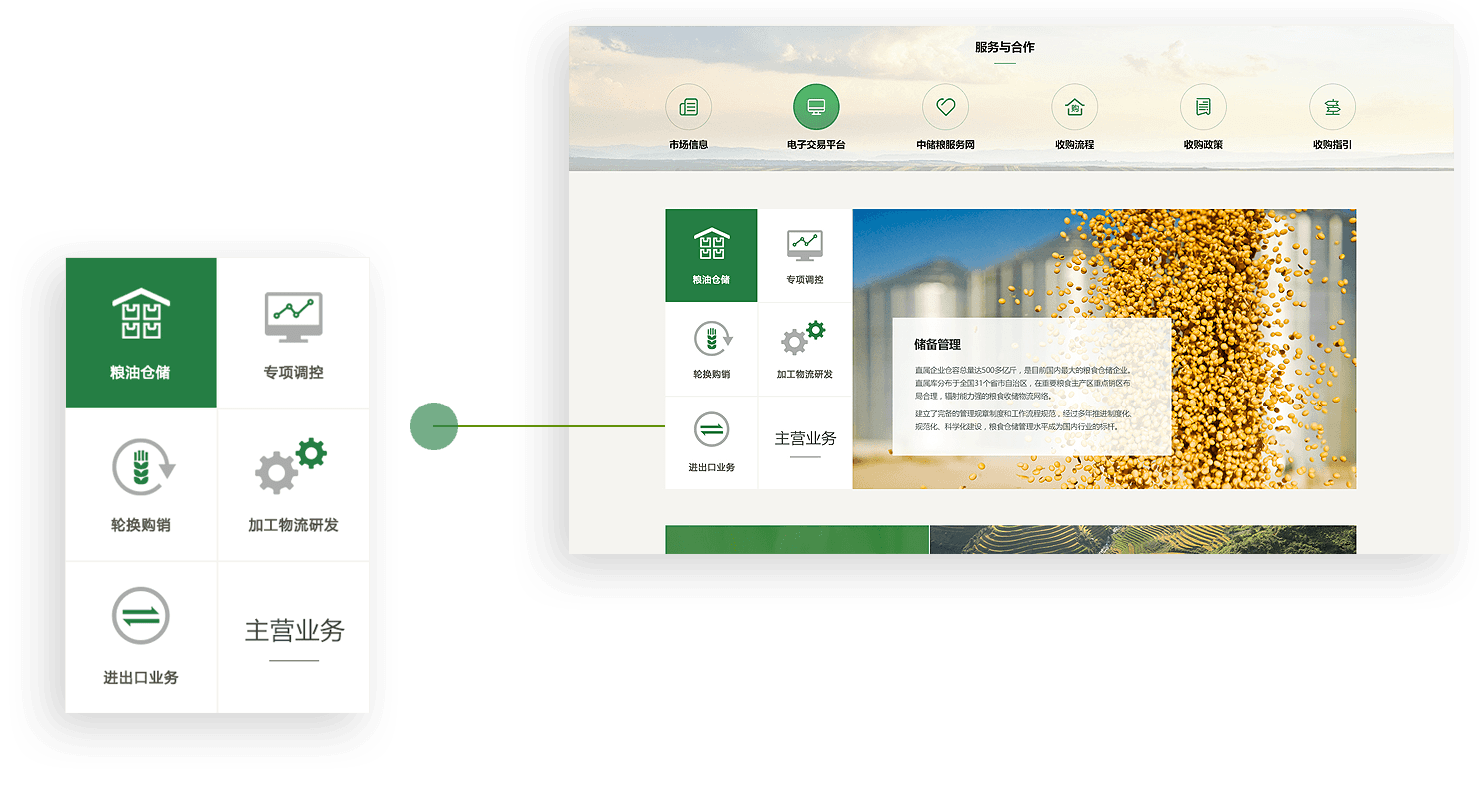 中儲糧官網(wǎng)采用扁平化ICON的方式,集中展示儲備管理、輪換購銷、專項調(diào)控等多元業(yè)務(wù),在保證用戶便于閱讀的基礎(chǔ)上,通過創(chuàng)意、交互吸引用戶關(guān)注。