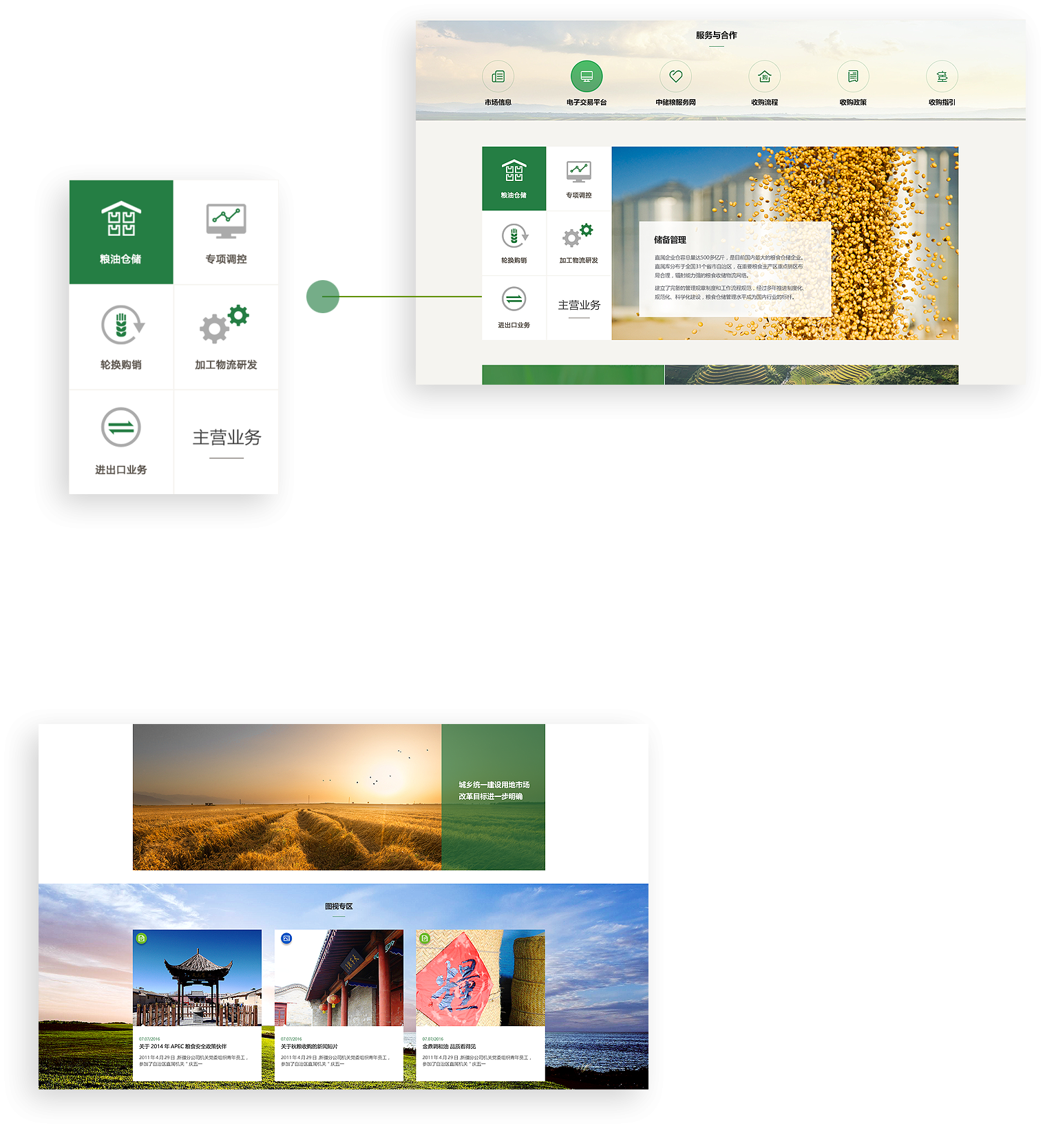 中儲(chǔ)糧官網(wǎng)采用扁平化ICON的方式,集中展示儲(chǔ)備管理、輪換購(gòu)銷、專項(xiàng)調(diào)控等多元業(yè)務(wù),在保證用戶便于閱讀的基礎(chǔ)上,通過創(chuàng)意、交互吸引用戶關(guān)注。