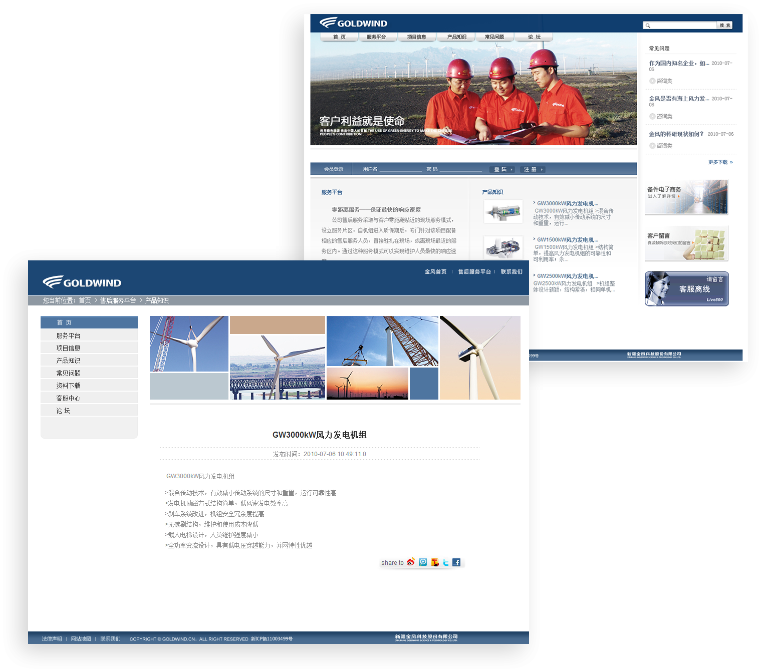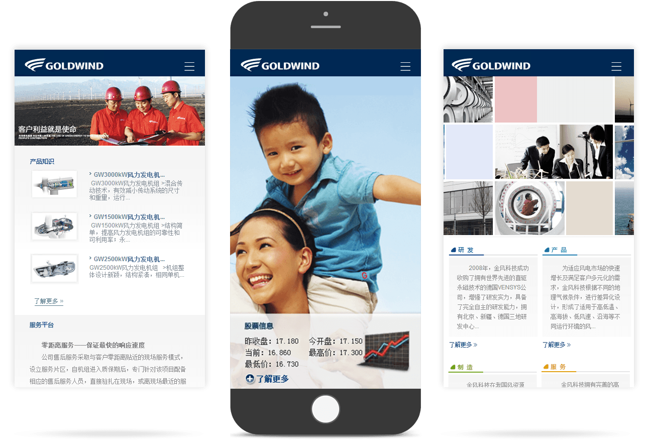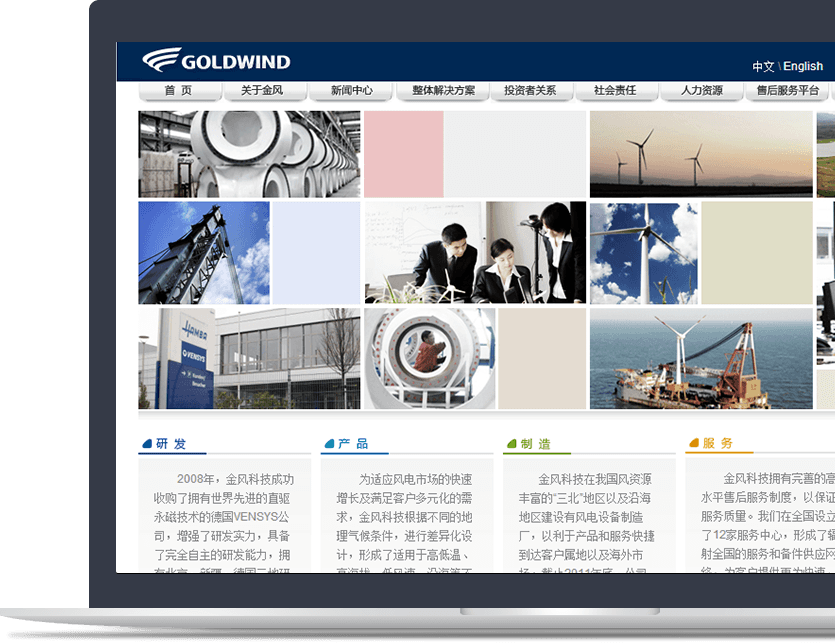 網(wǎng)站整體設(shè)計(jì)契合企業(yè)的領(lǐng)域?qū)傩裕骖櫰放婆c產(chǎn)品雙重需求,視覺效果簡(jiǎn)潔大氣,成 功塑造金風(fēng)科技創(chuàng)新、科技、國(guó)際化的品牌形象。