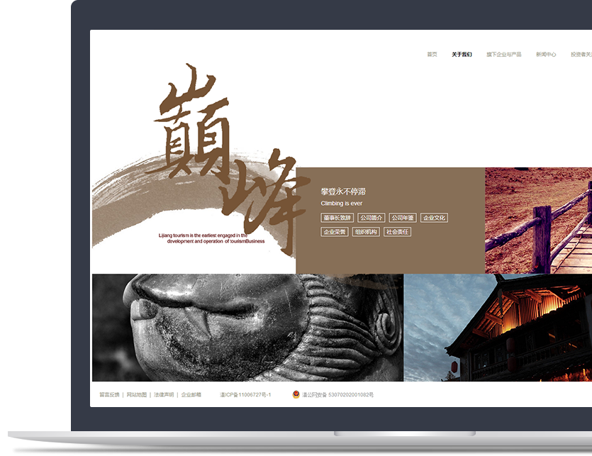 新鴻儒利用全屏背景圖的首頁設(shè)計方式,展示麗江玉龍的企業(yè)品牌形象以及麗江特色美景,將傳統(tǒng)與時尚結(jié)合,將古典與現(xiàn)代結(jié)合,成功打造了一個高品質(zhì)旅游類企業(yè)官網(wǎng)。