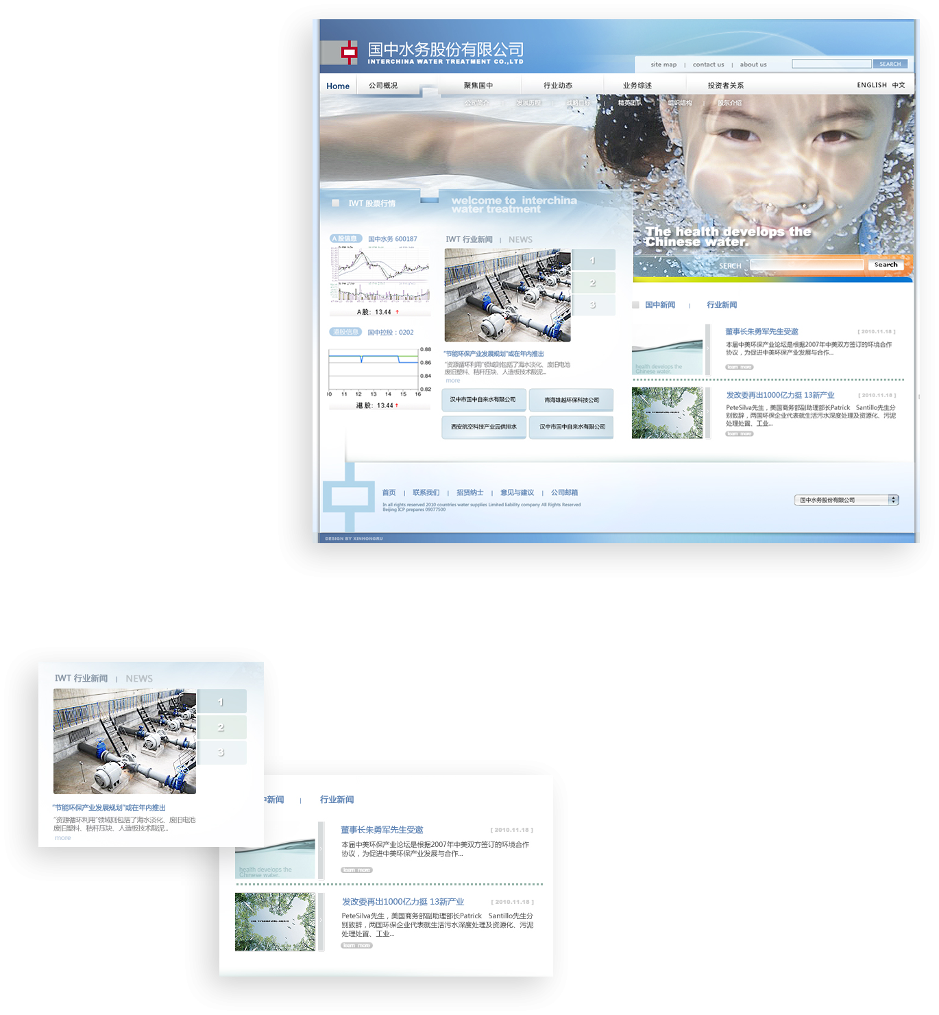 新鴻儒持續(xù)為國中控股、國中水務(wù)打造官方網(wǎng)站,在兼顧同一體系內(nèi)企業(yè)的視覺統(tǒng)一性的基礎(chǔ)上,通過不 同的表達(dá)方式塑造個性化的品牌官網(wǎng)
