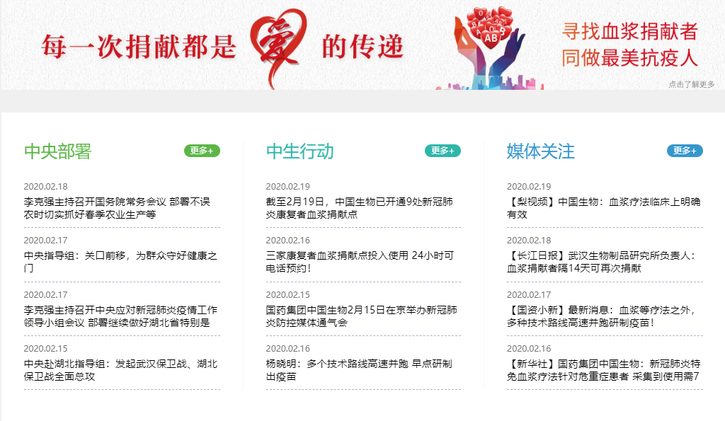 新鴻儒為中國(guó)生物所制作的專題欄目,首先,響應(yīng)國(guó)家中央部署,承擔(dān)央企使命,第一時(shí)間更新中央下達(dá)意見;第二,在中國(guó)生物的研究下,捐獻(xiàn)血漿成為重中之重,號(hào)召與查詢?nèi)肟谛桴r明可見;第三,防疫知識(shí),是大眾最關(guān)心的部分,足夠?qū)I(yè)貼心的防疫知識(shí),可穩(wěn)定人心;最后,群眾關(guān)注、媒體關(guān)注的進(jìn)程動(dòng)態(tài)實(shí)時(shí)更新。