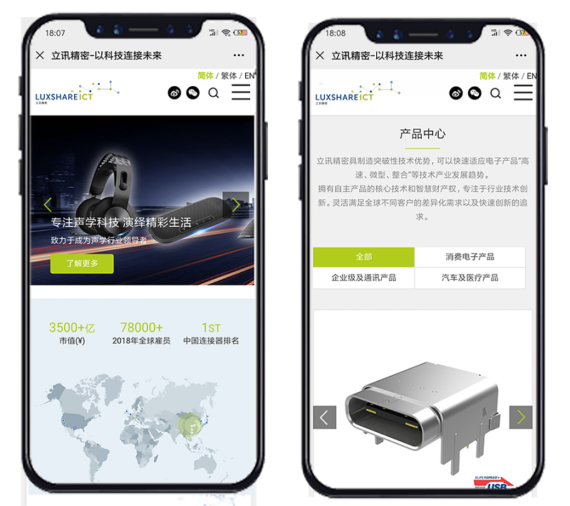 因此作為中國互聯(lián)網資深服務商,新鴻儒為立訊精密提供官網建設及維護,在提升整體品牌形象的同時,更幫助立訊規(guī)劃準確定位網站目標群體,設定網站整體架構,規(guī)劃、設計網站欄目及其內容,制定網站開發(fā)流程及順序,提供數字品牌建設整體解決方案,以同時適應PC端,手機端的呈現(xiàn)方式,最大限度地進行高效資源分配與管理的設計。