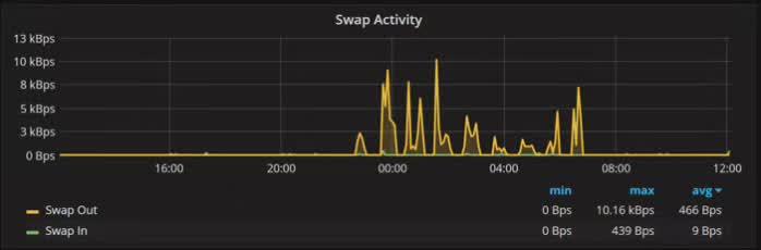 如圖所示,如果你看到有大于 1MB 每秒的持續(xù)交換活動的話,您就需要減少緩沖池的大小了,或者使用其他的內存。