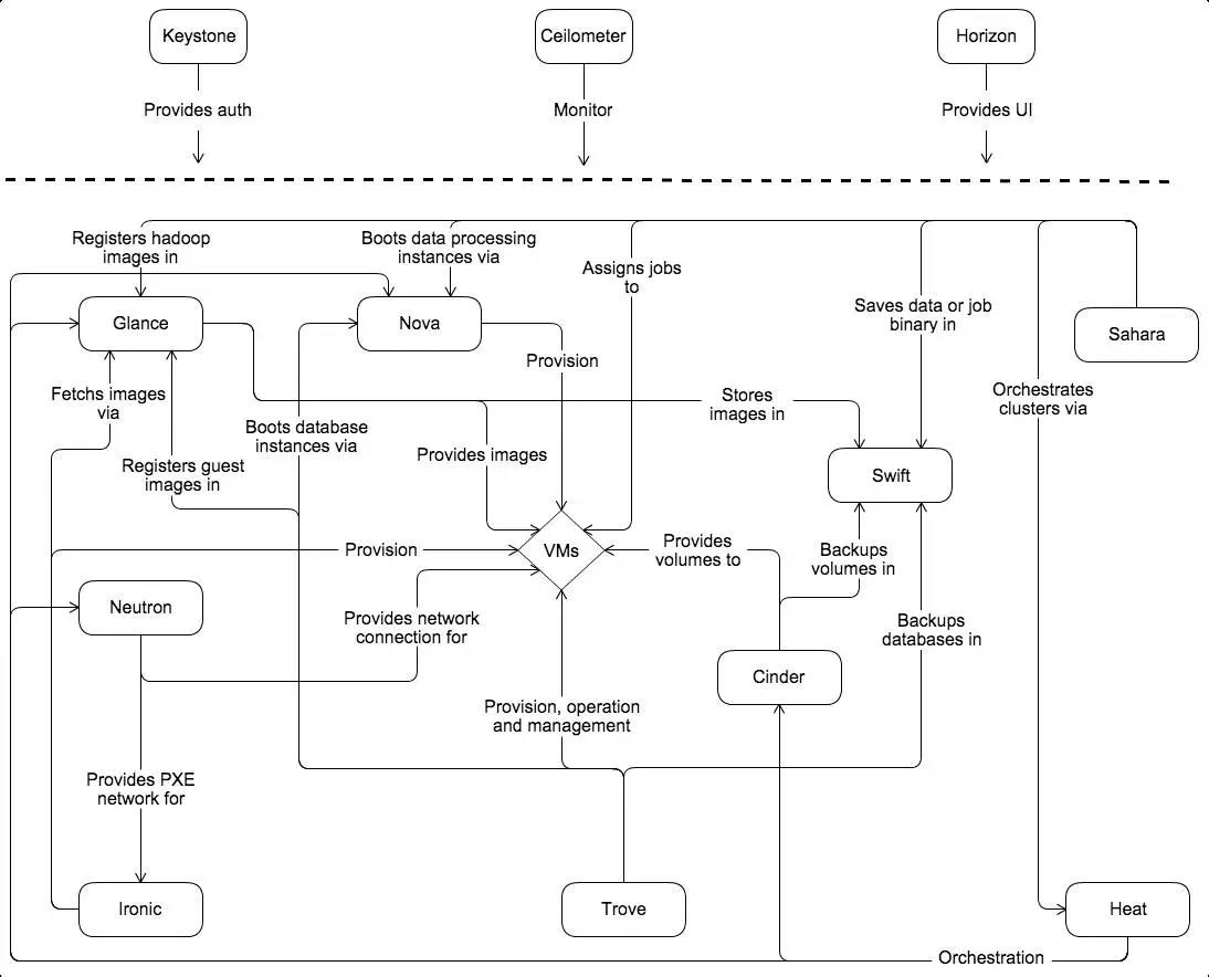 Openstack是IaaS層目前最活躍的一個(gè)開源的云計(jì)算 IaaS 平臺,即云操作系統(tǒng),類似于AWS(亞馬遜的云服務(wù)),通過各種開源組件實(shí)現(xiàn)了不同功能,目前大部分云管理平臺均基于Openstack實(shí)現(xiàn)計(jì)算、網(wǎng)絡(luò)、存儲的統(tǒng)一管理,Openstack支持如下功能組件: