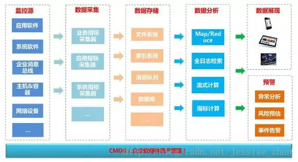 統(tǒng)一監(jiān)控平臺由七大角色構(gòu)成:監(jiān)控源、數(shù)據(jù)采集、數(shù)據(jù)存儲、數(shù)據(jù)分析、數(shù)據(jù)展現(xiàn)、預(yù)警中心、CMDB(企業(yè)軟硬件資產(chǎn)管理)。